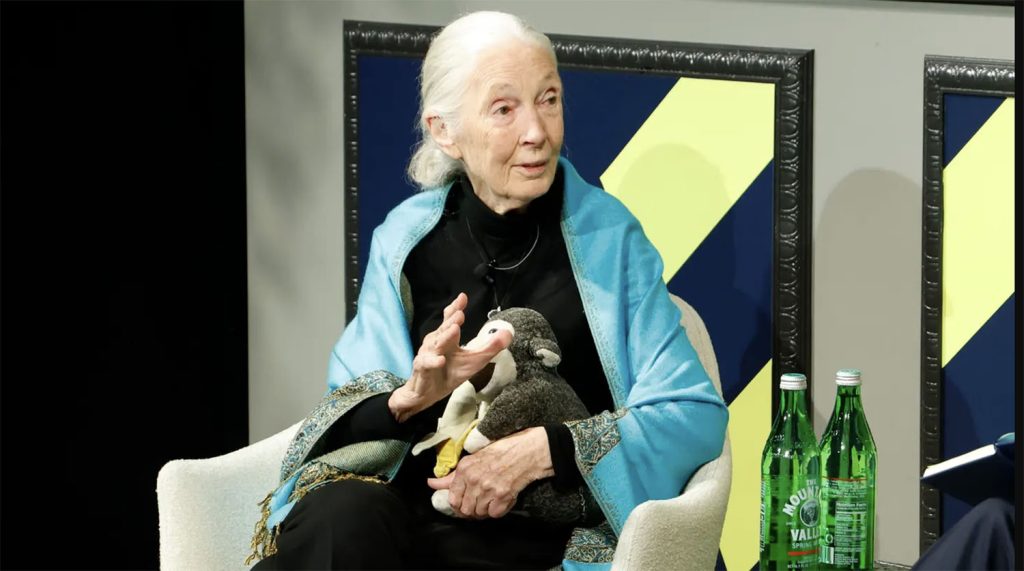Dr. Jane Goodall, Founder of the Jane Goodall Institute and UN Messenger of Peace, speaking during Climate Week NYC at the 2025 Forbes Sustainability Leadership Summit, September 22, 2025. Credit: Taylor Hill / Getty Images
