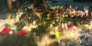 The makeshift memorial created for Renee Nicole Macklin Good, a 37-year-old poet, writer and mother of three, where her car came to rest near the corner of Portland Avenue S …
