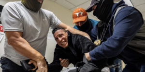 US Immigration and Customs Enforcement (ICE) agents and federal officers detain a migrant as he walks out from a hearing at a US immigration court in Manhattan on Oct. 27, …