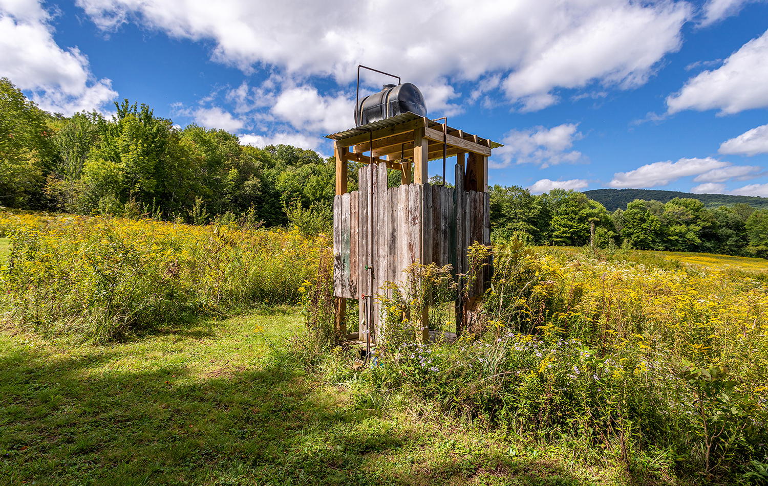Rustic outdoor shower in wildflower meadow with wooden enclosure Posted on February 18, 2026 by Admin