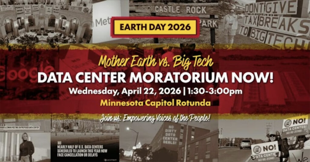 1:30 – 3pm Mother Earth or Big Tech? A People’s Hearing on Data Centers, Capitol Rotunda – Send a message to lawmakers and hear testimony from impacted residents from across the state and policy experts calling on lawmakers to take immediate action before the legislative session concludes May 17. Lawmakers need to act now on behalf of people, not Big Tech billionaires behind these projects. We’ll be wearing RED! Feel free to bring Signs/Banners (without sticks) and don’t forget to leave time for parking & Capitol Security screening!